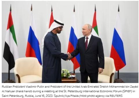 當(dāng)?shù)貢r間16日,阿聯(lián)酋總統(tǒng)穆罕默德·本·扎耶德·阿勒納哈揚(yáng)與俄羅斯總統(tǒng)普京在圣彼得堡國際經(jīng)濟(jì)論壇會晤。圖片來源:路透社報道截圖