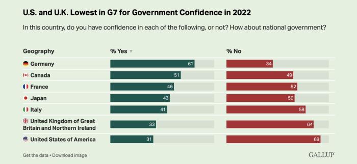 據(jù)《國會(huì)山報(bào)》當(dāng)?shù)貢r(shí)間7月3日報(bào)道,根據(jù)蓋洛普最新發(fā)布的一項(xiàng)針對七國集團(tuán)政府信心指數(shù)的民意調(diào)查顯示,美國和英國獲得的信心指數(shù)最低。
