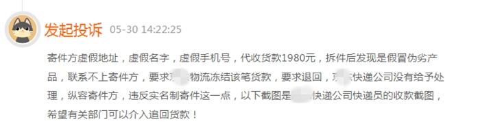 記者也注意到,在黑貓投訴平臺上就有消費者投訴稱,“寄件方是虛假地址、虛假名字、虛假手機號”,快遞平臺代收貨款1980元,拆件后發(fā)現(xiàn)是假冒偽劣產(chǎn)品,聯(lián)系不上寄件方,要求快遞公司凍結(jié)該筆貨款并退回,快遞公司沒有給予處理。