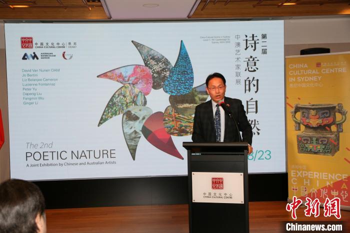 當?shù)貢r間7月6日晚,第二屆“詩意的自然—中澳藝術家聯(lián)展”在悉尼開幕。圖為悉尼中國文化中心主任兼中國駐悉尼旅游辦事處主任肖夏勇在開幕式上致辭。中新社記者 顧時宏 攝