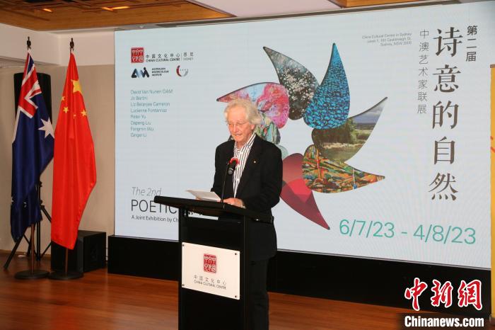 當?shù)貢r間7月6日晚,第二屆“詩意的自然—中澳藝術家聯(lián)展”在悉尼開幕。圖為澳大利亞水彩畫協(xié)會主席大衛(wèi)·范·紐恩在開幕式上致辭。中新社記者 顧時宏 攝