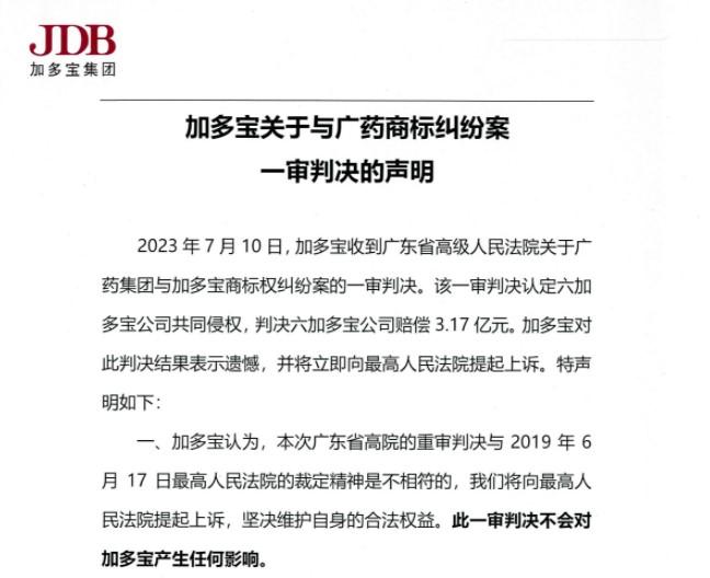 7月10日,加多寶發(fā)布《加多寶關于與廣藥商標糾紛案一審判決的聲明》,稱當天收到廣東省高級人民法院關于廣藥集團與加多寶商標權糾紛案的一審判決。該一審判決認定六加多寶公司共同侵權,判決六加多寶公司賠償3.17億元。