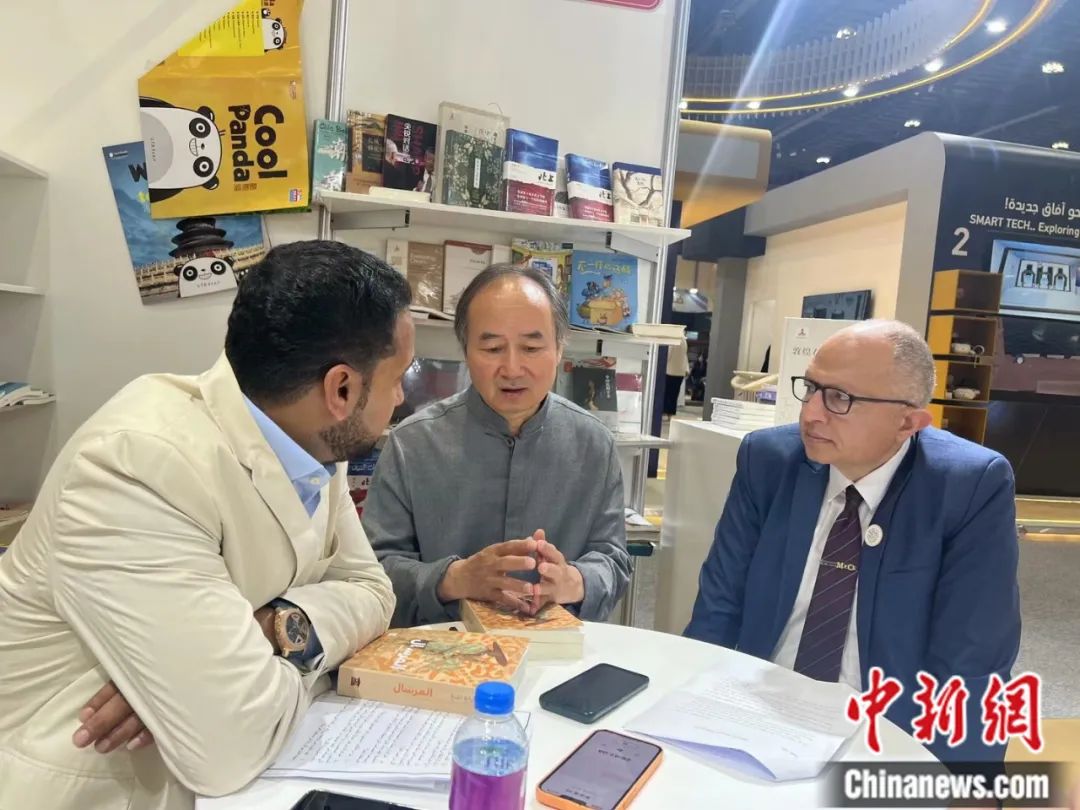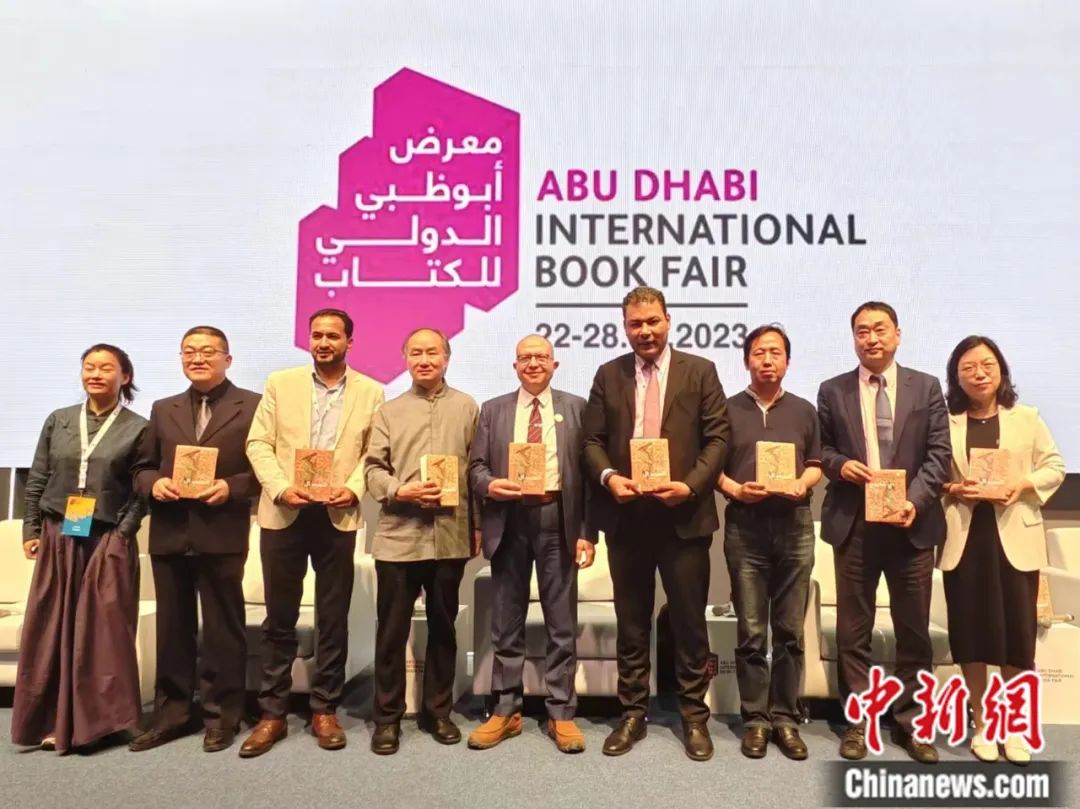 在阿布扎比國際書展上,譯林出版社與埃及??诉~特文化集團聯合舉辦《捎話》阿拉伯文版新書首發(fā)儀式。譯林出版社 供圖