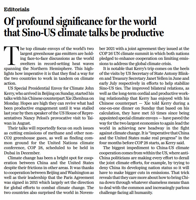 在舉世關注中,世界最大的兩個經濟體的氣候特使舉行了面對面會談。當前,北半球正在經歷創(chuàng)紀錄的熱浪,凸顯了中美在氣候問題上攜手合作多么重要。