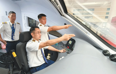 4月13日,在老撾萬象站,中老雙方司機在首列萬象至昆明的中老鐵路國際旅客列車上為發(fā)車做準備。