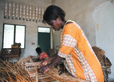6月21日,在位于布隆迪經濟首都布瓊布拉的卡蒙蓋手工業(yè)培訓中心,學員在生產車間制作藤編產品。