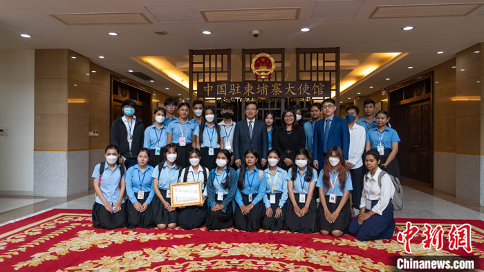 圖為中國(guó)駐柬埔寨大使王文天與參加活動(dòng)的柬埔寨亞歐大學(xué)師生合影。 中國(guó)駐柬大使館 供圖