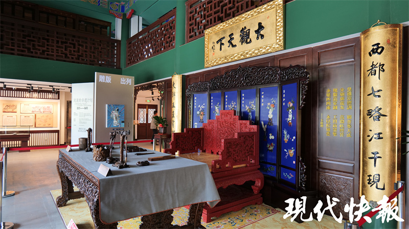 記者在現場看到,復建的文匯閣主體建筑尊重歷史原貌,仿照天一閣建筑規(guī)制,面闊六間,明二暗三,硬山筒瓦。走進文匯閣,一樓主要是文匯閣歷史文化展陳區(qū)域。大廳正中,擺放了一張抄書桌,當年讀書人可以在此借書、抄書。書桌上方有一塊寫著“大觀天下”的匾額,據工作人員介紹,當年天寧寺行宮御花園的正殿叫做“大觀堂”,文匯閣就建在大觀堂旁邊,“大觀天下”寓意讀書可以開闊眼界、胸懷古今、放眼天下。