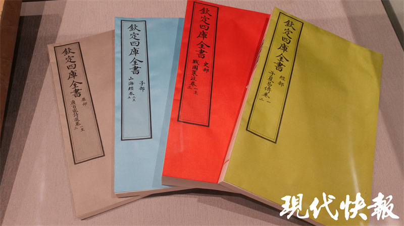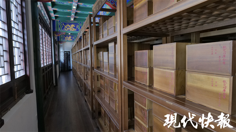文匯閣二樓、三樓收藏了一部《四庫全書》,據了解,這部《四庫全書》是2013年由商務印書館榮譽出版、揚州國書文化公司策劃制作的原樣、原大、原色《四庫全書》復制本。它與原書大小、顏色、紙質、裝幀相同,封面仍是絹帛五色:經部綠色、史部紅色、子部月白色、集部灰黑色、總目黃色。書籍與書函、書架配套,共計木函6144個、書架128個?!端膸烊珪返难b潢非??季浚坎繒加脙善酒瑠A住,束以綢帶,再放入楠木盒中。盒蓋上刻有書籍的書名和所屬部類順序等信息,以便查閱。現在,游客經過預約就可以可到二樓參觀《四庫全書》部分藏書,親身感受這套浩瀚巨制。