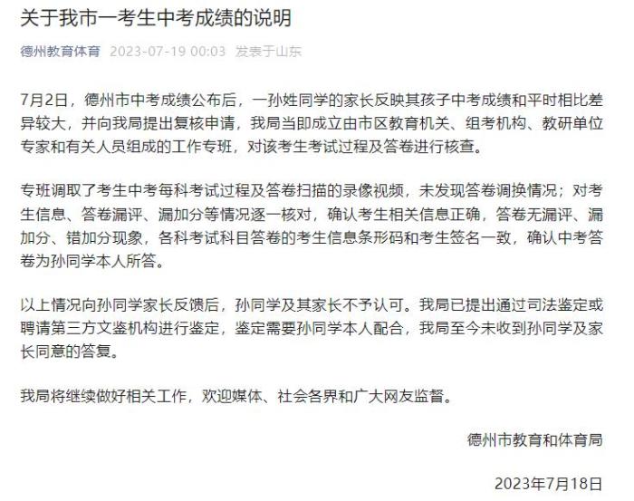 以上情況向?qū)O同學家長反饋后,孫同學及其家長不予認可。德州市教育和體育局已提出通過司法鑒定或聘請第三方文鑒機構(gòu)進行鑒定,鑒定需要孫同學本人配合,德州市教育和體育局至今未收到孫同學及家長同意的答復。