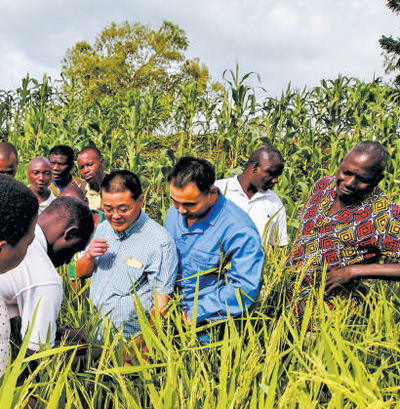 中國中化控股有限責(zé)任公司旗下荃銀高科的水稻專家在多哥示范田現(xiàn)場(chǎng),為當(dāng)?shù)剞r(nóng)民講解水稻抽穗揚(yáng)花期的關(guān)鍵技術(shù)和田間管理要點(diǎn)。