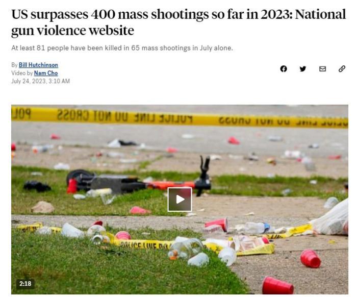 中新網(wǎng)7月24日電 據(jù)美國廣播公司(ABC)24日報(bào)道,美國“槍支暴力檔案”的數(shù)據(jù)顯示,在2023年,美國已發(fā)生超過400起大規(guī)模槍擊事件。該網(wǎng)站將大規(guī)模槍擊事件定義為造成4人或4人以上傷亡的單一事件。