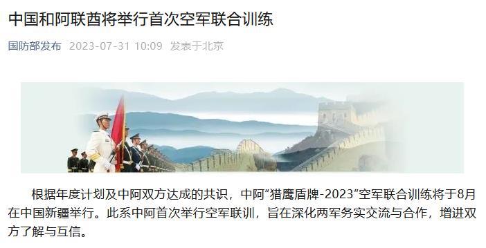 中新網(wǎng)7月31日電 據(jù)“國防部發(fā)布”微信公眾號31日消息,根據(jù)年度計(jì)劃及中阿雙方達(dá)成的共識,中阿“獵鷹盾牌-2023”空軍聯(lián)合訓(xùn)練將于8月在中國新疆舉行。此系中阿首次舉行空軍聯(lián)訓(xùn),旨在深化兩軍務(wù)實(shí)交流與合作,增進(jìn)雙方了解與互信。