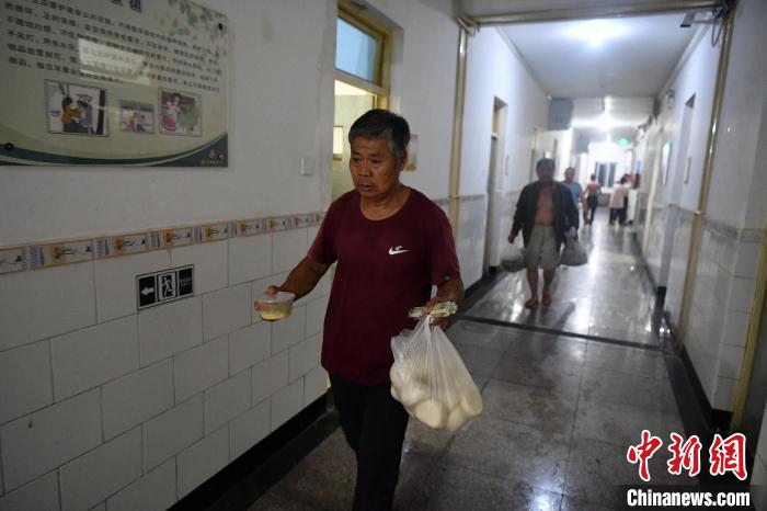 8月1日晚,在涿州市職業(yè)技術(shù)教育中心臨時安置點,民眾剛領(lǐng)取晚飯?!≈行律缬浾?翟羽佳 攝