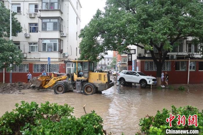 8月1日,北京市門頭溝區(qū)橋東街,工程車輛在街道清淤?!≈行律缬浾?盛佳鵬 攝