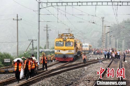 8月1日,北京門頭溝區(qū),豐沙鐵路妙峰山鎮(zhèn)水峪嘴村段,工作人員前往鐵路線清淤搶修。7月29日以來,北京地區(qū)持續(xù)強(qiáng)降雨,西南部降雨量大。受降雨影響,北京豐臺至沙城鐵路(豐沙線)嚴(yán)重水害?!≈行律缬浾?盛佳鵬 攝