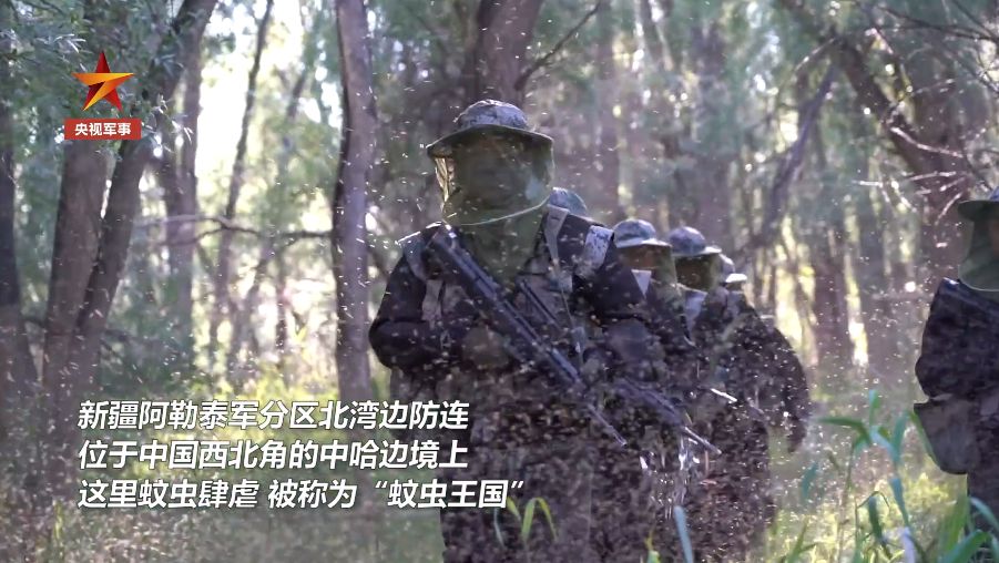 新疆阿勒泰軍分區(qū)北灣邊防戰(zhàn)士穿行蚊子群巡邏。一路上數(shù)以萬計(jì)的蚊子、蠓蟲撲面而來。圖片來源:央視軍事視頻截圖
