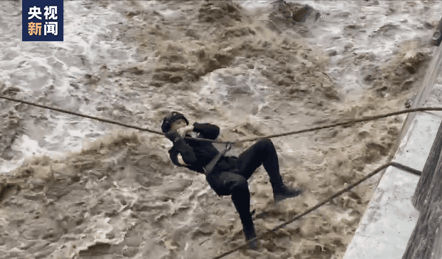 2022年9月5日,四川甘孜州瀘定縣發(fā)生6.8級(jí)地震,磨西鎮(zhèn)與青崗坪交匯處,湍急的流水?dāng)r住去路。甘孜特警隊(duì)員們用身體和繩索搭建橋梁,徒手爬繩索前往對(duì)岸救援。圖片來源:央視新聞視頻截圖