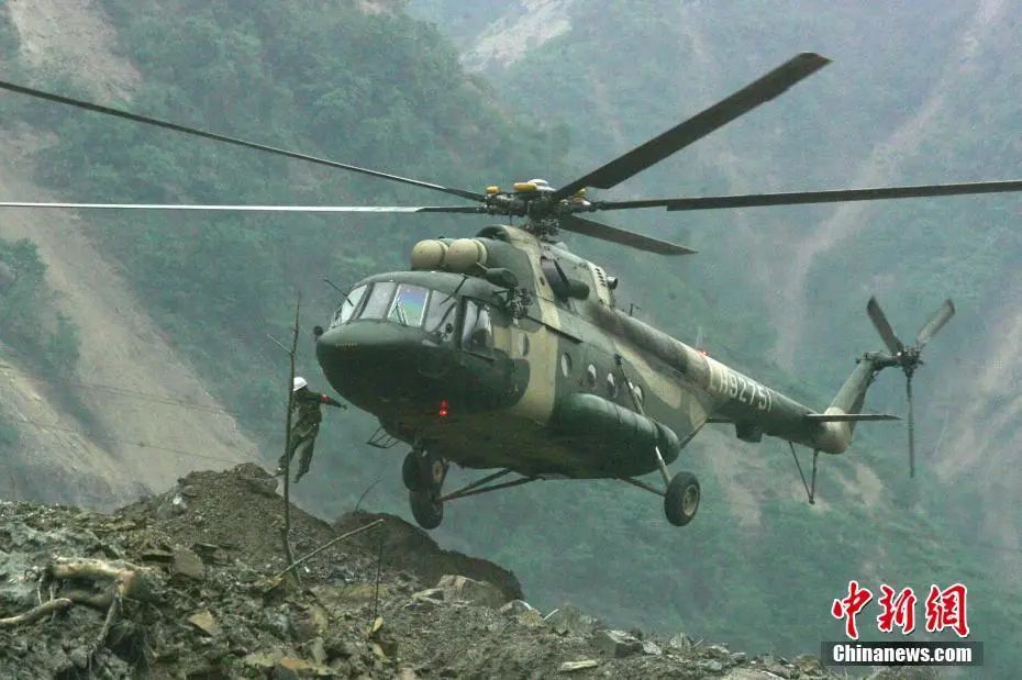2008年5月20日,成都軍區(qū)陸航團(tuán)姜廣偉王牌直升機(jī)組上午十時(shí)以單輪首次成功強(qiáng)降北川重災(zāi)區(qū)“定時(shí)炸彈”——堰塞湖無名塌方小土堆上。中新社記者 賈國(guó)榮 攝