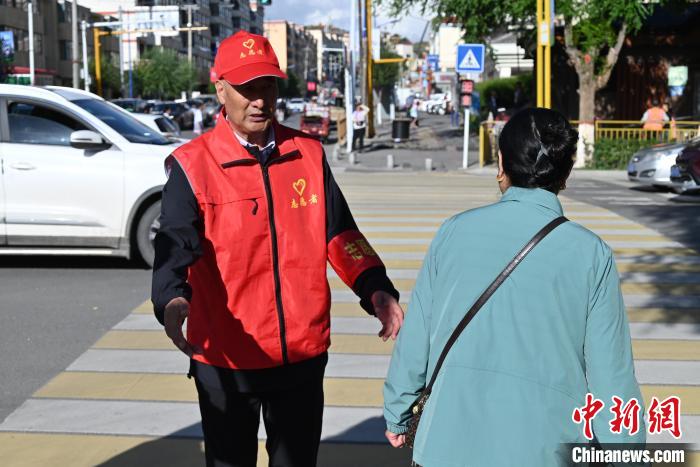 圖為彭措在共和縣城當(dāng)志愿者。武俊杰 攝