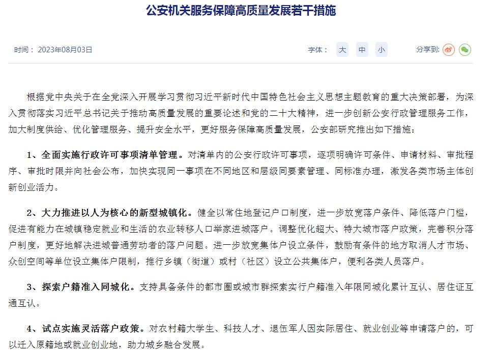 8月3日,公安部發(fā)布公安機(jī)關(guān)服務(wù)保障高質(zhì)量發(fā)展若干措施,其中在戶籍政策方面提出一系列舉措。