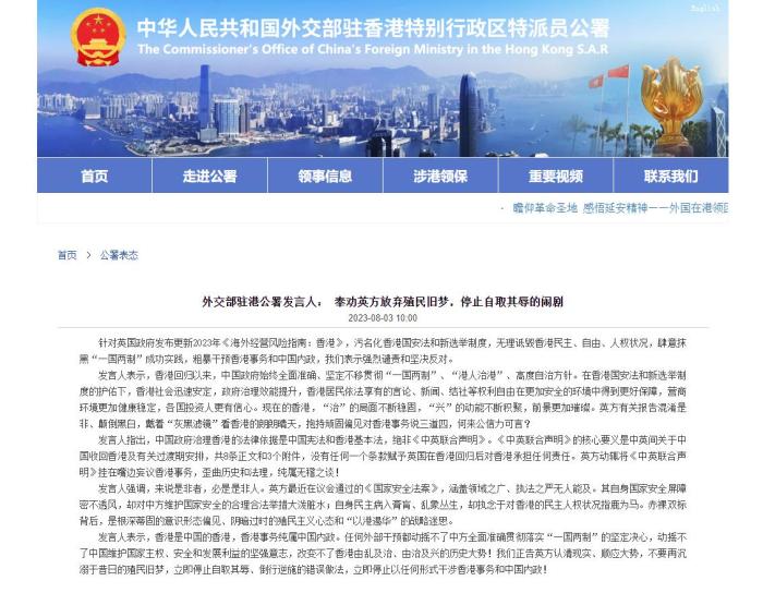 中新網(wǎng)8月3日電 據(jù)外交部駐港公署網(wǎng)站消息,針對英國政府發(fā)布更新2023年《海外經(jīng)營風(fēng)險指南:香港》,污名化香港國安法和新選舉制度,無理詆毀香港民主、自由、人權(quán)狀況,肆意抹黑“一國兩制”成功實踐,粗暴干預(yù)香港事務(wù)和中國內(nèi)政,外交部駐港公署表示強烈譴責(zé)和堅決反對。