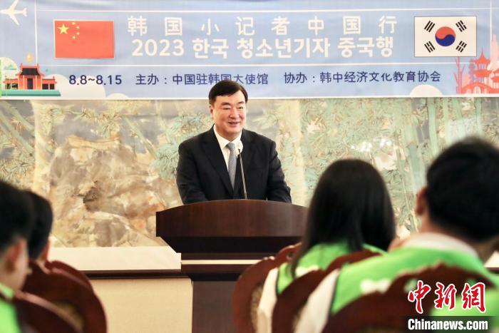 8日,“2023韓國小記者中國行”活動在首爾舉行啟程儀式。圖為中國駐韓國大使邢海明致辭。中國駐韓國大使館供圖