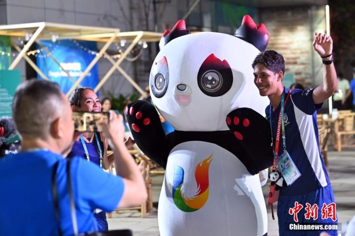 資料圖:參賽運(yùn)動員在大運(yùn)村與“蓉寶”合影。中新社記者 九美旦增 攝