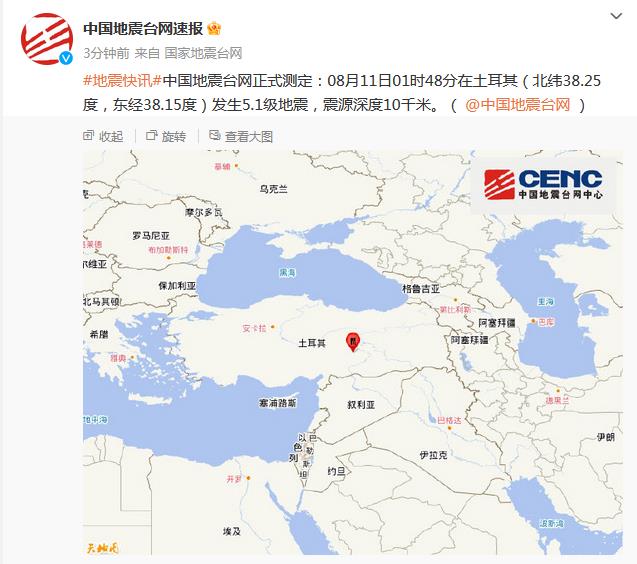 中新網(wǎng)8月11日電 據(jù)國家地震臺(tái)網(wǎng)官方微博消息,中國地震臺(tái)網(wǎng)正式測定:8月11日01時(shí)48分在土耳其(北緯38.25度,東經(jīng)38.15度)發(fā)生5.1級(jí)地震,震源深度10千米。