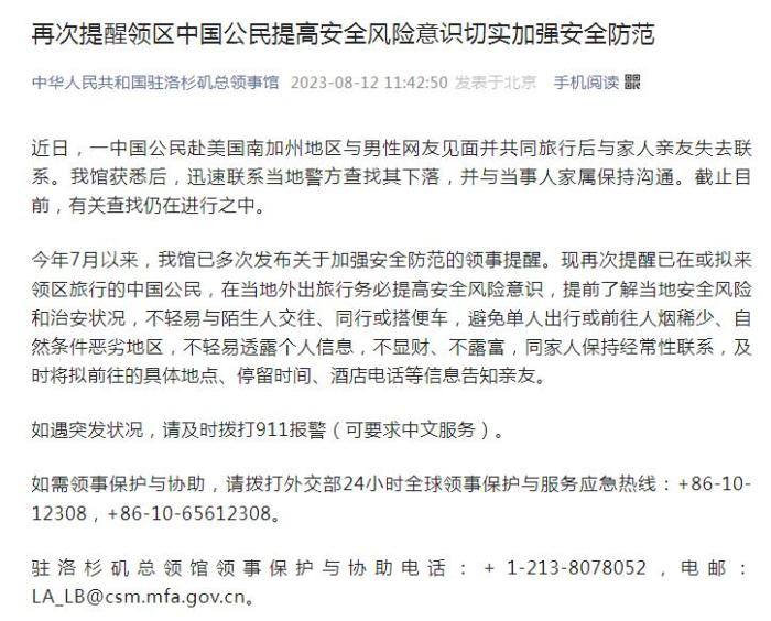 中新網(wǎng)8月12日電 據(jù)中國(guó)駐洛杉磯總領(lǐng)事館官方公眾號(hào)12日消息,近日,一中國(guó)公民赴美國(guó)南加州地區(qū)與男性網(wǎng)友見面并共同旅行后與家人親友失去聯(lián)系。中國(guó)駐洛杉磯總領(lǐng)事館獲悉后,迅速聯(lián)系當(dāng)?shù)鼐讲檎移湎侣?,并與當(dāng)事人家屬保持溝通。截至目前,有關(guān)查找仍在進(jìn)行之中。