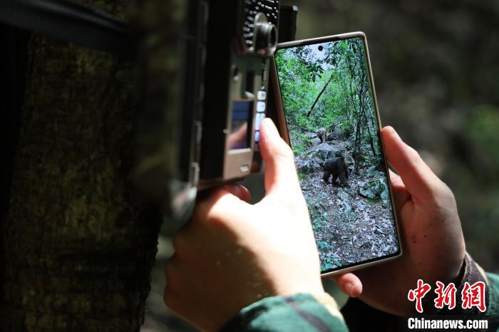 安徽大學(xué)研究團(tuán)隊(duì)在安徽省黃山市湯口鎮(zhèn)浮溪村——黃山野生猴谷檢查監(jiān)控視頻。樊成柱 攝