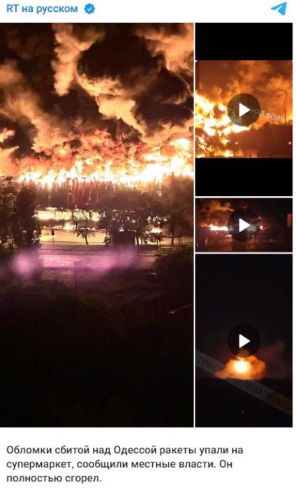“今日俄羅斯”(RT)稱,在敖德薩上空被擊落的導(dǎo)彈碎片墜落在一家超市,超市被完全燒毀。此外,一所教育機構(gòu)的宿舍樓也遭到破壞。