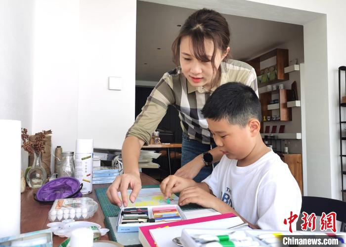 8月8日,吳婷婷在指導(dǎo)小朋友畫畫?! ≈行律缬浾?向一鵬 攝