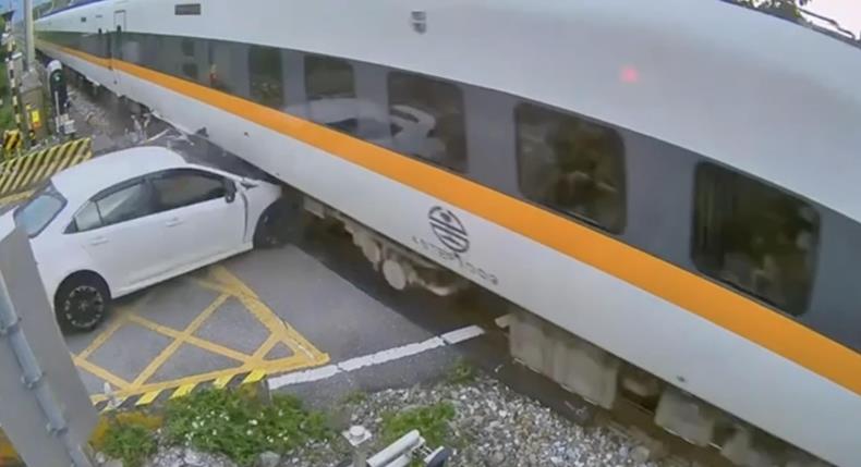 根據(jù)監(jiān)視器畫面,太魯閣號(hào)北上行駛,列車已通過平交道約一半的位置,這時(shí)白色轎車不知何故突然沖破平交道柵欄,直接撞擊列車車廂下方。撞擊力過大車輛直接翻倒約180度,車頭全毀。