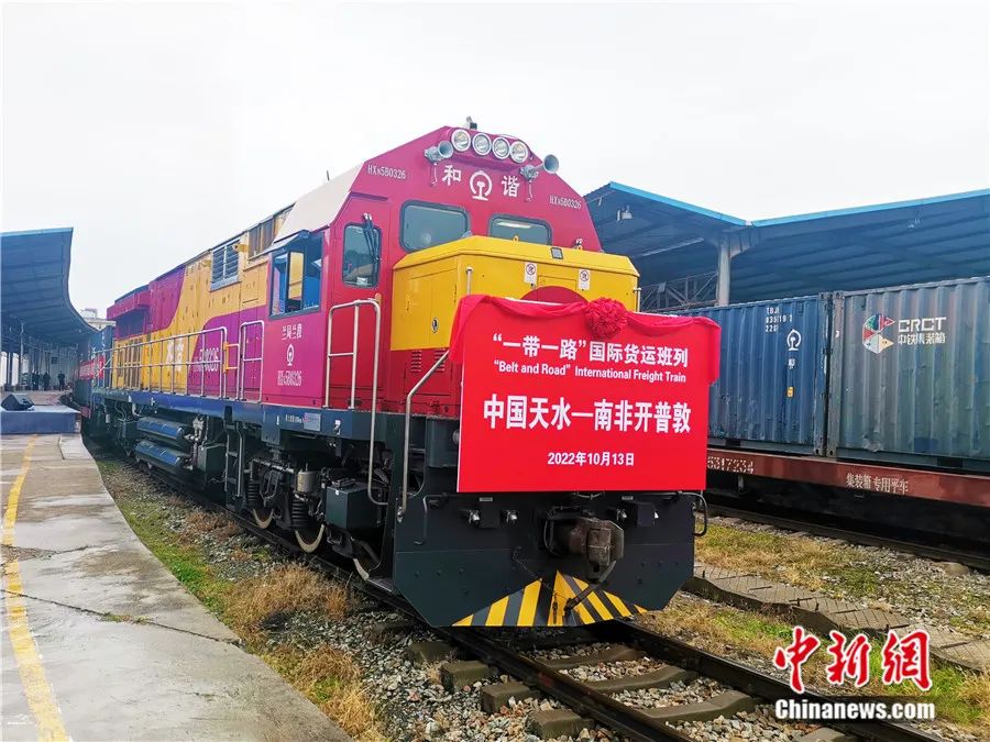 2022年10月13日,“中國(guó)天水—南非開(kāi)普敦”國(guó)際班列順利發(fā)運(yùn)。這是首趟甘肅發(fā)運(yùn)的中國(guó)至非洲農(nóng)產(chǎn)品專(zhuān)列。李志杰 攝