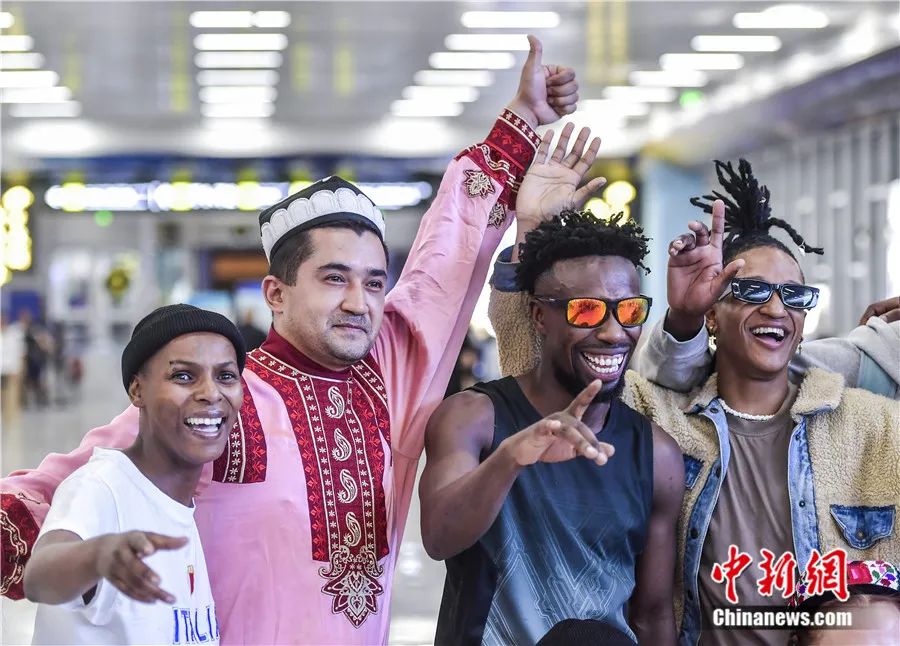 2023年7月23日,參加第六屆中國(guó)新疆國(guó)際民族舞蹈節(jié)的南非埃爾維斯舞蹈藝術(shù)團(tuán)乘機(jī)抵達(dá)烏魯木齊,主辦方用新疆歌舞迎接遠(yuǎn)道而來(lái)的客人。劉新 攝