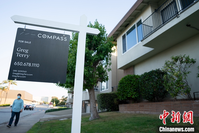當?shù)貢r間8月22日,美國加州圣馬特奧縣一處公寓前掛出售房廣告。中新社記者 劉關(guān)關(guān) 攝