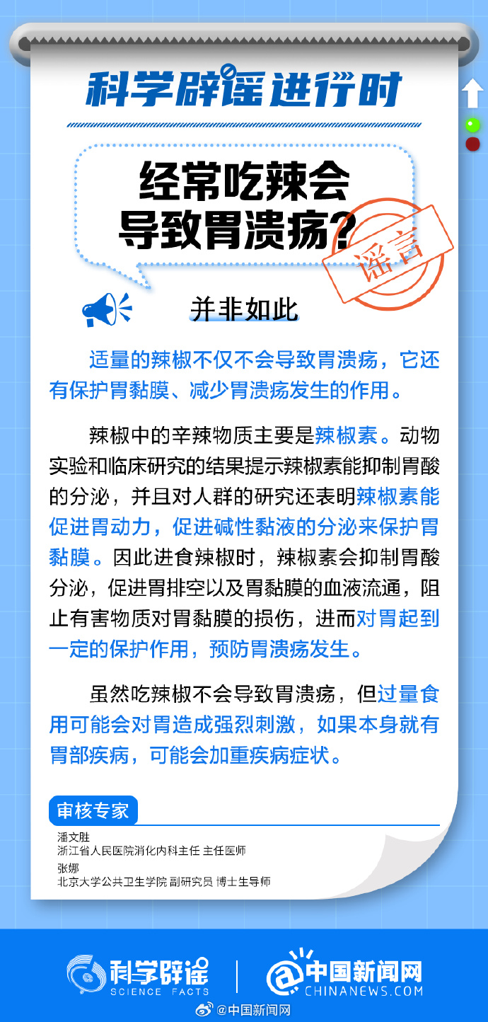 中新網(wǎng)8月23日電 適量的辣椒不僅不會導致胃潰瘍,它還有保護胃黏膜、減少胃潰瘍發(fā)生的作用。辣椒中的辣椒素會抑制胃酸分泌,促進胃排空以及胃黏膜的血液流通,阻止有害物質(zhì)對胃黏膜的損傷,進而對胃起到一定的保護作用,預防胃潰瘍發(fā)生。但過量食用辣椒可能會對胃造成強烈刺激,如果本身就有胃部疾病,可能會加重疾病癥狀。(來源:@科學辟謠 @中國新聞網(wǎng) )