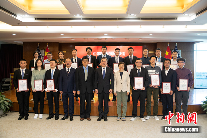 圖為中國駐紐約總領(lǐng)事黃屏(前排中)、紐約州立大學(xué)布法羅分校終身教授張杰(前排左五)、負(fù)責(zé)教育事務(wù)的參贊余有根(前排左四)等與獲獎(jiǎng)學(xué)生合影。 中新社記者 廖攀 攝