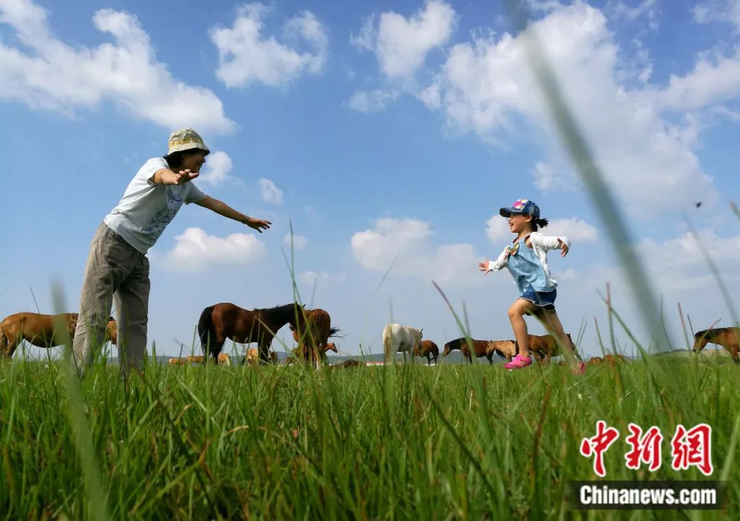2016年8月,祖孫倆在塞罕壩機(jī)械林場(chǎng)內(nèi)玩耍。在半個(gè)多世紀(jì)的時(shí)間里,塞罕壩人將昔日飛鳥(niǎo)不棲、黃沙遮天的荒原,變成百萬(wàn)畝人工林海。楊可佳 攝
