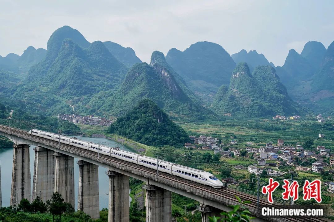 2019年5月,一列動(dòng)車(chē)穿越位于廣西陽(yáng)朔縣興坪鎮(zhèn)內(nèi)的幸福源特大橋。陳冠言 攝