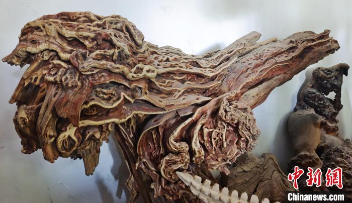 中新網(wǎng)新疆阿拉爾9月2日電(史玉江)一根腐朽的樹根,或許在別人眼里一文不值,可是在戴新看來,朽木可雕琢,那些腐朽的樹根不僅能做成工藝品,還能增收致富?!霸诎⒗瓲栠@片土地上,各種樹根和朽木段,不管是沙漠中的,還是河道里的,只要我看上,都盡可能搬回來。”新疆生產(chǎn)建設(shè)兵團第一師阿拉爾市“非遺”根雕傳承人戴新說,通過自己的雙手制作的根雕作品,讓他的生活樂趣無限。