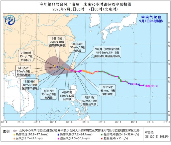 9月3日08時至4日08時,內(nèi)蒙古東北部、吉林西部、廣西中南部、廣東西南部、臺灣島大部等地部分地區(qū)有中到大雨,其中,廣西中部、臺灣島中東部等地部分地區(qū)有暴雨或大暴雨,臺灣島東部部分地區(qū)有特大暴雨(250~600毫米)。浙江東南部、福建東部沿海部分地區(qū)有5~7級風。北部灣、瓊州海峽、東海南部、臺灣以東洋面、臺灣海峽、巴士海峽、南海東北部有6~8級大風、陣風10~11級,其中臺灣以東洋面、臺灣海峽、巴士海峽北部、南海東北部部分海域風力可達9~11級、陣風13~14級。