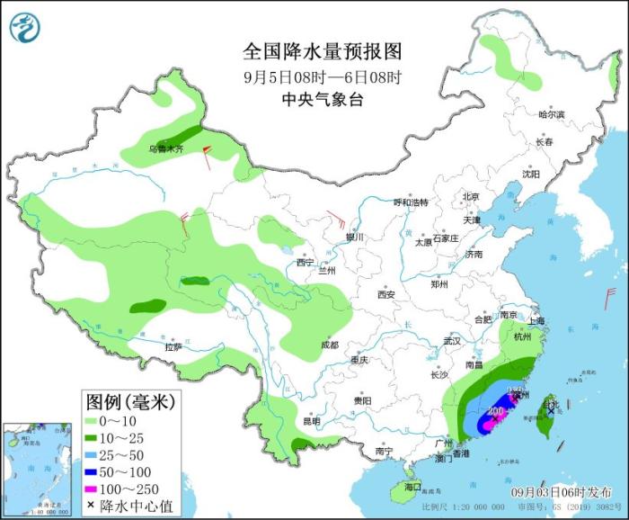 9月5日08時至6日08時,新疆沿天山地區(qū)、浙江南部、福建大部、江西東南部、廣東中東部、臺灣島等地部分地區(qū)有中到大雨,其中,福建東南部、廣東東部等地部分地區(qū)有暴雨或大暴雨(100~200毫米)。內(nèi)蒙古西北部、青海西部等地部分地區(qū)有4~6級風,其中,新疆東部部分地區(qū)有8~9級風。東海南部、臺灣以東洋面、臺灣海峽、巴士海峽、南海東北部有6~8級大風、陣風10~11級,其中臺灣以東洋面、臺灣海峽、巴士海峽北部、南海東北部部分海域風力可達9~11級、陣風13~14級。