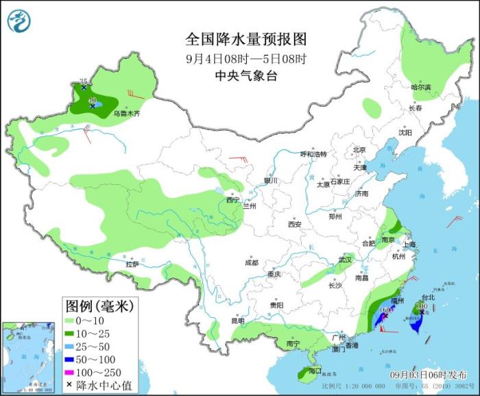 9月4日08時至5日08時,新疆沿天山地區(qū)和伊犁河谷、福建東南部、廣東東部、海南島西北部、臺灣島等地部分地區(qū)有中到大雨,其中,福建東南部沿海地區(qū)、廣東東南部沿海、臺灣島東部等地部分地區(qū)有暴雨或大暴雨(100~160毫米)。內(nèi)蒙古西北部、新疆南疆盆地、福建東部沿海等地部分地區(qū)有5~7級風。東海南部、臺灣以東洋面、臺灣海峽、巴士海峽、南海東北部有6~8級大風、陣風10~11級,其中臺灣以東洋面、臺灣海峽、巴士海峽北部、南海東北部部分海域風力可達9~11級、陣風13~14級。