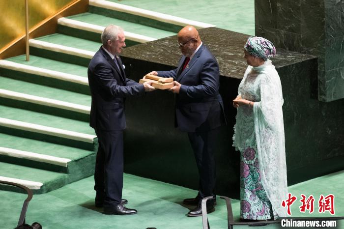 當(dāng)?shù)貢r(shí)間9月5日,第77屆聯(lián)合國大會在紐約聯(lián)合國總部閉幕。在聯(lián)合國常務(wù)副秘書長阿明娜(右)的見證下,第77屆聯(lián)大主席克勒希(左一)將象征聯(lián)大主席權(quán)力的議事槌交給第78屆聯(lián)大主席弗朗西斯(中)。中新社記者 廖攀 攝