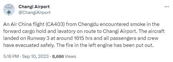 中新網(wǎng)9月10日電 綜合報道,當?shù)貢r間10日,新加坡樟宜機場在社交媒體發(fā)文稱,一架從中國成都起飛的中國國際航空公司航班(CA403)在飛往該機場的途中前貨艙和衛(wèi)生間冒出煙霧。該航班于下午4時15分左右降落在樟宜機場3號跑道。左側發(fā)動機的火已被撲滅。
