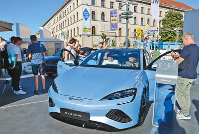 位于慕尼黑市中心的城市公共展示區(qū),不少觀眾參觀體驗比亞迪電動汽車。