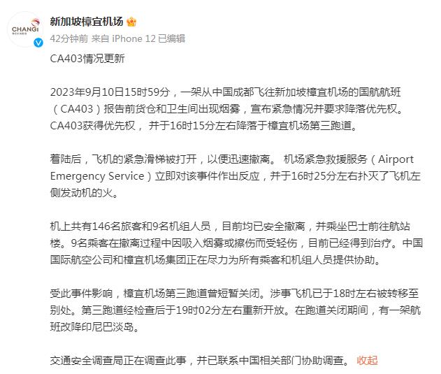 機上共有146名旅客和9名機組人員,目前均已安全撤離,并乘坐巴士前往航站樓。9名乘客在撤離過程中因吸入煙霧或擦傷而受輕傷,目前已經(jīng)得到治療。中國國際航空公司和樟宜機場集團正在盡力為所有乘客和機組人員提供協(xié)助。