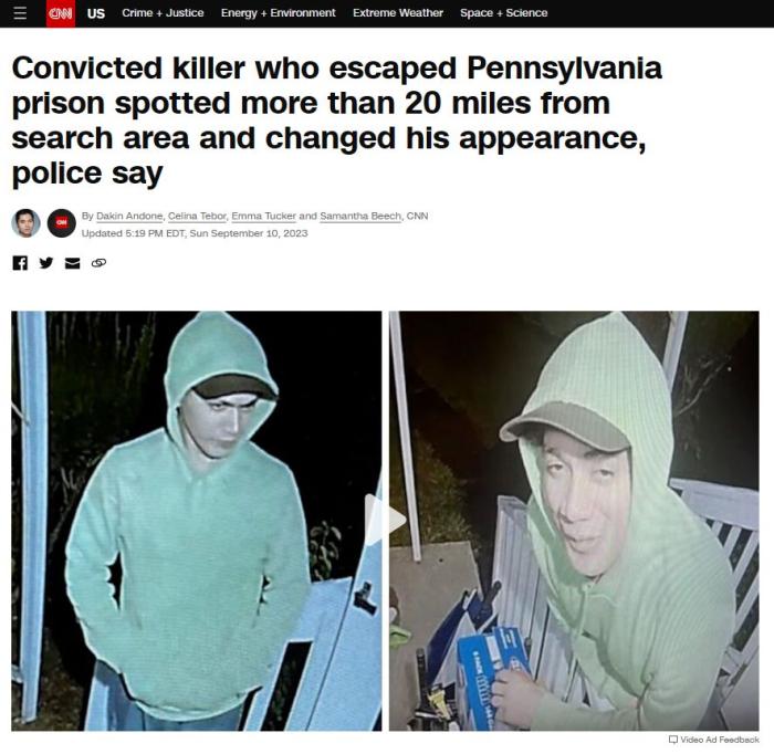 據(jù)賓州警方介紹,卡瓦爾坎特在逃跑中還曾聯(lián)系2位前同事,要求與其見面。截至當(dāng)?shù)貢r間10日下午,警方尚不確定卡瓦爾坎特是否攜帶武器,但警方能夠確認(rèn)他自越獄后曾進入幾棟住宅。尚不清楚他是否從這些地方拿走東西。